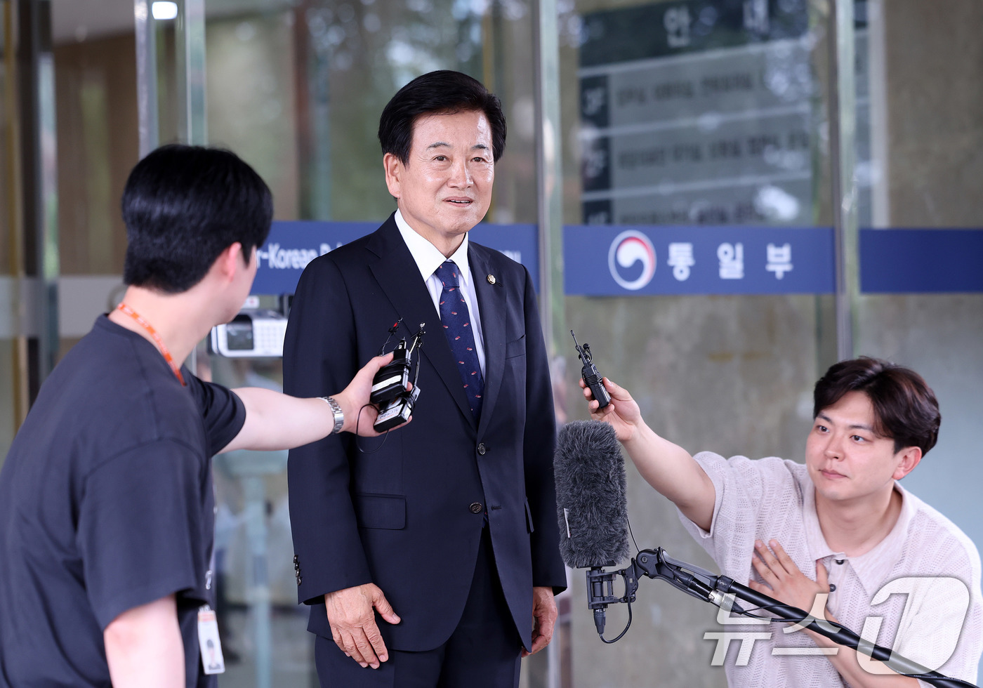 정동영 통일부 장관 후보자가 서울 종로구 남북관계관리단에 마련된 인사청문회 준비 사무실에 도착해 취재진 질문에 답하고 있다. 2025.6.24/뉴스1 ⓒ News1 박지혜 기자 |