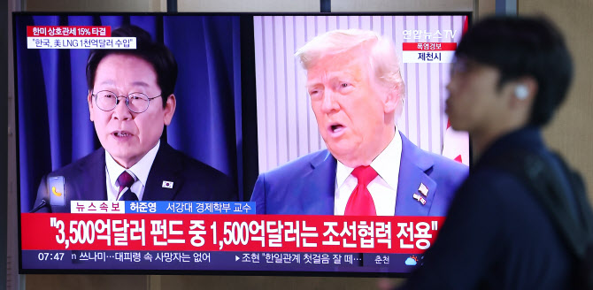 한국과 미국의 관세협상이 타결된 31일 서울역 대합실에서 한 시민이 관련 뉴스가 나오는 TV 앞을 지나고 있다. (사진=연합뉴스) |