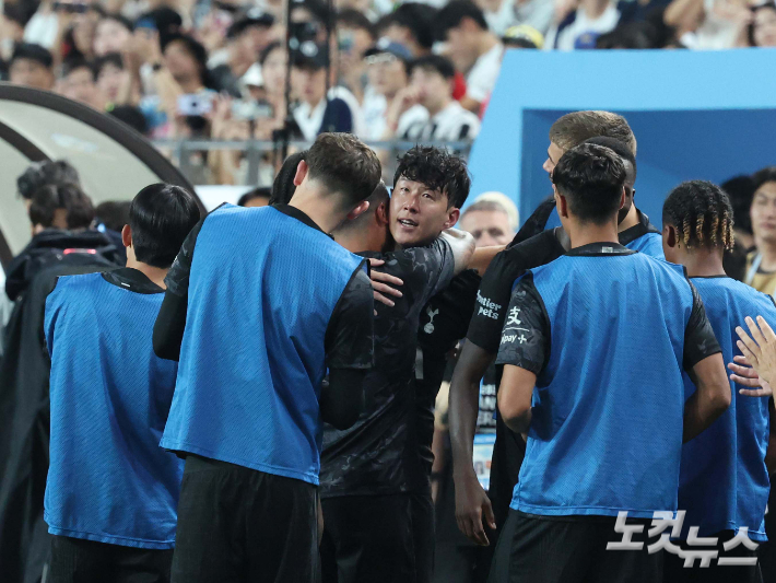 토트넘 손흥민이 3일 오후 서울 마포구 월드컵경기장에서 열린 '2025 쿠팡플레이 시리즈' 프리미어리그 토트넘과 뉴캐슬의 경기에서 교체되며 눈물 흘리고 있다. 황진환 기자 |