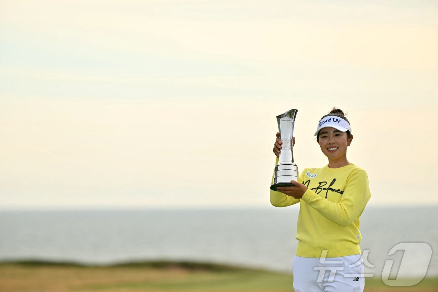 야마시타 미유(일본)가 3일(현지시간) 열린 AIG 위민스 오픈에서 우승한 뒤 트로피를 들고 포즈를 취하고 있다. ⓒ AFP=뉴스1 |