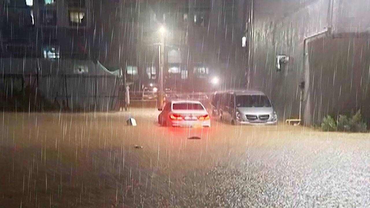 역류한 하수관에서 물줄기가 쉼 없이 솟구치고, 아파트단지 지하주차장으로 토사가 섞인 물이 빠르게 흘러 들어갑니다.
