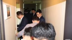 송언석 원내대표를 비롯한 국민의힘 의원들이 18일 서울 여의도의 DB 관리업체 사무실에 들어서고 있다. 김건희특검팀은 ‘통일교- 2025.09.19 01:14