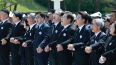 (광주=연합뉴스) 박철홍 정다움 기자 = 제45주년 5·18 민주화운동 기념식에 참석한 제21대 대선 후보들이 '5·18 정신- 2025.05.18 11:51