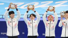 문재인 대통령은 2022 베이징동계올림픽 쇼트트랙 남자 5,000m 계주에서 은메달을 획득한 곽윤기, 김동욱, 박장혁, 황대헌, 이준서 선수에게 오늘만큼- 2022.02.17 00:01