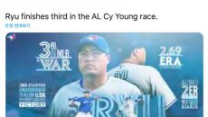 “정말 대단한 첫 시즌” 토론토 SNS, 류현진 사이영상 3위 축하