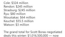 보라스, 류현진 계약으로 이번 겨울에만 10억 달러 돌파