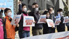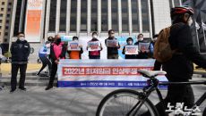 [서울=뉴스핌] 윤창빈 기자 = 민주노총이 5일 오후 최저임금위원회 전원회의가 열린 서울 중구 프레스센터 앞에서 2022년 최- 2022.04.05 15:06