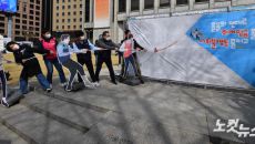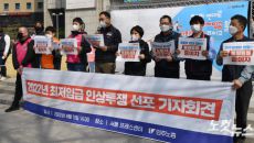 민주노총이 5일 서울 프레스센터 앞에서 2023년 적용 최저임금인상투쟁 선포 기자회견을 하고 있다. 저작권자 © CBS 노컷뉴- 2022.04.05 15:00