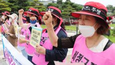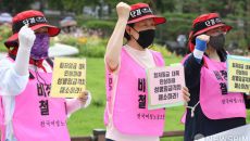 [서울=뉴스핌] 백인혁 기자 = 전국여성노동조합 관계자들이 2일 오전 서울 종로구 청와대 앞 분수대 광장에서 '여성들이 요구한- 2021.07.02 12:21