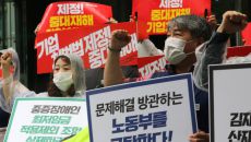 [서울=뉴스핌] 백인혁 기자 = 중대재해기업처벌법 제정 운동본부 관계자들이 22일 오후 서울 중구 서울지방고용노동청 앞에서 반- 2020.07.22 12:40