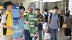 8일 서울역 앞에서 최저임금연대 등 양대 노동단체 회원들이 최저임금 삭감안을 제출한 사용자단체를 규탄하는 캠페인을 하고 있다.- 2019.07.08 12:53