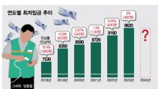 내년도 최저임금 9860원으로 2.5% 인상...경제단체 일제히 유감 표명 내년도 최저임금(시급)이 올해보다 2.5% 인상된- 2023.07.19 11:02
