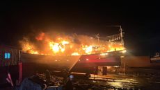(제주=연합뉴스) 백나용 기자 = 25일 오후 8시 55분께 제주시 구좌읍 한 조선소에서 건조 중이던 배에서 불이 났다. 소방- 2025.01.25 21:21
