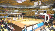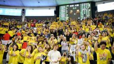 4쿼터를 앞두고 창원 체육관엔 노란 물결이 일렁였다. ‘봄 농구’ 시작부터 노란색 티셔츠로 경기장을 물들이고 있는 연고지 팬- 2025.05.09 21:48