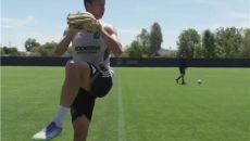 "꽤 머네요" 손흥민 글러브 꼈다! LA 다저스 시구 연습 열중, 축구화에 야구공 조합 → 팀 골키퍼가 포수로