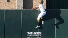 [스포티비뉴스=신원철 기자] 메이저리그에 홈런 도둑이 나타났다. 애슬레틱스 중견수 덴젤 클락이 비거리 121m 짜리 홈런성 타- 2025.06.10 21:05