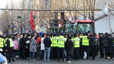 ▲ 26일 서울 종로구 자하문로에서 경찰들이 전국농민회총연맹(전농) 소속 트랙터를 둘러싸고 있는 가운데 시민단체 회원들과 대치- 2025.03.26 14:34