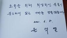 사실상 대권 의지 드러내 검찰총장 당시 "바른 검찰 만들겠다" 이날 방명록엔 "분노하지 않는 나라 만들겠다" 정치행보 본격화할- 2021.06.05 23:17