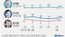 (서울=연합뉴스) 고동욱 기자 = 이재명 경기도지사와 더불어민주당 이낙연 대표, 윤석열 검찰총장의 대권 지지율 격차가 약간 좁- 2021.03.04 14:21