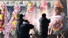 오늘(5일) 오전 9시 50분쯤, 한 70대 남성이 서울 서초구 대검찰청 앞에 놓인 윤석열 검찰총장 응원 화환에 인화물질을 뿌- 2021.01.05 17:08