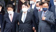 대선출마 앞둔 윤석열, 취재진 바라보며