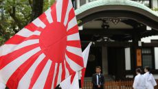 ▲ 지난해 8월 15일 태평양전쟁 A급 전범이 합사된 도쿄 지요다구 야스쿠니신사를 찾은 이들이 욱일기를 들고 있다. 자민당 소- 2025.08.13 13:35