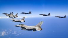 ▲ F-16과 KF-16 전투기 총 4대(편대 왼편)와 F-15K(편대 오른편) 전투기 4대가 공군 자체 사전훈련을 실시하는- 2024.10.25 11:28