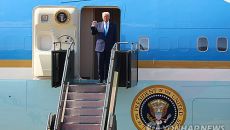 [한미정상회담] 트럼프 '주먹 불끈' 첫 등장…F-16, 에어포스원 에스코트(종합)