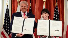 도널드 트럼프 미국 대통령과 다카이치 사나에 일본 총리가 주일 미 해군 기지에 있는 원자력 항공모함에 함께 승선해 양국 동맹- 2025.10.28 18:16