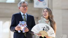 (서울=뉴스1) 김도우 기자 = 유홍준 국립중앙박물관장과 넷플릭스 애니메이션 영화 '케이팝 데몬 헌터스'의 메기 강 감독이 2- 2025.08.21 10:58