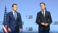 (브뤼셀 AFP=뉴스1) 이정환 기자 = 피트 헤그세스 미국 국방장관(왼쪽)과 마크 뤼터 북대서양조약기구(나토·NATO) 사무- 2025.10.16 08:54