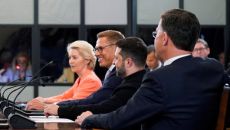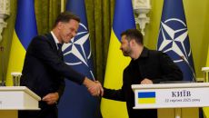 (키이우 AFP=뉴스1) 류정민 특파원 = 볼로드미르 젤렌스키 우크라이나 대통령이 22일(현지시간) 키이우에서 마르크 뤼터 북- 2025.08.23 08:39