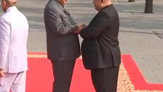 우원식 의장, 中서 열병식 참관 전 김정은과 악수 나눠