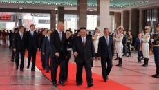 김정은 의전 ‘푸틴 바로 다음’…끝에서 두 번째 입장, 시진핑 왼쪽 자리