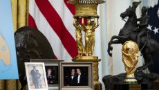 도널드 트럼프 미 대통령의 백악관 집무실(Oval Office)이 공개된 올 초 전세계 축구 팬들의 눈길은 그의 책상 뒤에 머- 2025.04.01 15:59