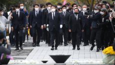 (서울·김해=연합뉴스) 이슬기 이은정 기자 = 국민의힘 윤석열 대선후보는 11일 고(故) 김대중(DJ)·노무현 전 대통령을 모- 2021.11.11 16:58
