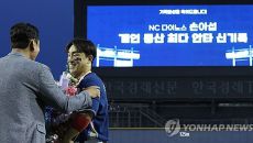 (서울=연합뉴스) 하남직 기자 = NC 다이노스는 손아섭(36)의 KBO리그 개인 통산 최다 안타 신기록 달성을 기념하는 트로- 2024.06.20 22:14