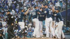 (서울=연합뉴스) 이대호 기자 = 프로야구 두산 베어스 투수 잭 로그와 LG 트윈스 내야수 오스틴 딘이 한국야구위원회(KBO)- 2025.10.08 13:14