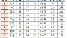 ◇ 2024 KBO리그 중간순위(12일) 순위 구단 승-패-무 승률 승차 연속 1 KIA 25-15-0 0.625 0.0 1패 2 N C 23-17-0- 2024.05.12 22:03
