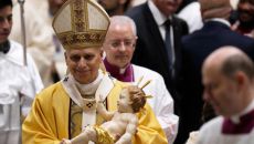 (서울=연합뉴스) 오수진 기자 = 교황 레오 14세가 24일(현지시간) 즉위 후 처음으로 집전한 성탄절 전야 미사에서 인간 존- 2025.12.25 15:47