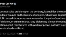 (바티칸=연합뉴스) 신창용 특파원 = '미국 출신' 레오 14세 교황이 미국의 이란 핵시설 공습을 비판하며 엑스(X·옛 트위터- 2025.06.24 21:58