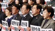 더불어민주당 이재명 대표(앞줄 가운데)가 9일 국회에서 열린 규탄대회에서 법원의 윤석열 대통령에 대한 구속취소 결정 후 즉시항- 2025.03.10 02:16