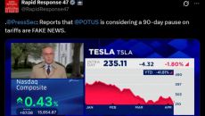 관세 유예 소식에 반등했던 美 주식 가짜 뉴스 밝혀지자 마이너스 추락 월가·외신도 다 속으며 혼란 양상 소셜미디어 X에 올라온- 2025.04.08 14:35