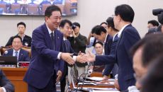 아세안 정상회의 참석 전 김병기 원내대표와 악수 나누는 이재명 대통령