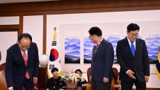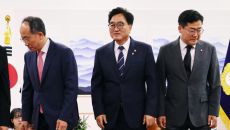우원식 국회의장-추경호·박찬대 원내대표, 악수 마치고 자리로…