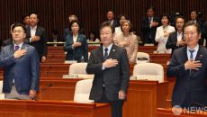 [서울=뉴스핌] 이형석 기자 = 박찬대 더불어민주당 원내대표가 28일 오후 서울 여의도 국회에서 열린 의원총회에서 국민의례를- 2024.05.28 14:39