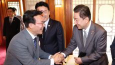 웃으며 인사 나누는 김민석 국무총리와 김병기 더불어민주당 대표 직무대행 겸 원내대표