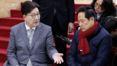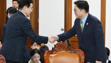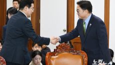 [서울=뉴스핌] 윤창빈 기자 = 우원식(오른쪽) 국회의장이 4일 서울 여의도 국회에서 열린 국회의장 주재 여야 원내대표 회동에- 2025.03.04 15:58