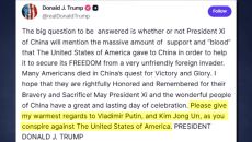 트럼프, 中 열병식에 “美 상대 음모 꾸민 푸틴·김정은에 안부”