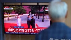 인민복 아닌 검은 양복에 금색 넥타이...김정은 아내·딸 없이 중국 열병식 입장